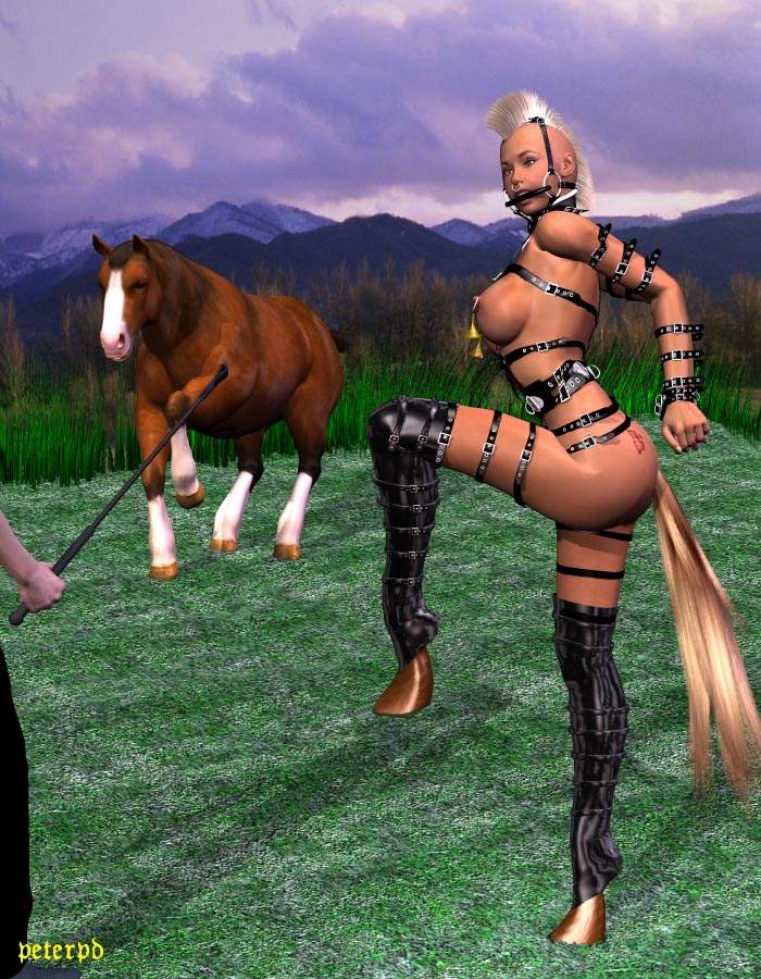 I let her sleep in the next day, still drugged, while I fitted her with pony boots. By the time she awoke near noon, I had also shaved her head into a mohawk cut, leaving her only a lovely blond central mane. Finally, the transformation of the still-virgin debutante was complete - she was to ready begin her life as Prince Peter's ponygirl.