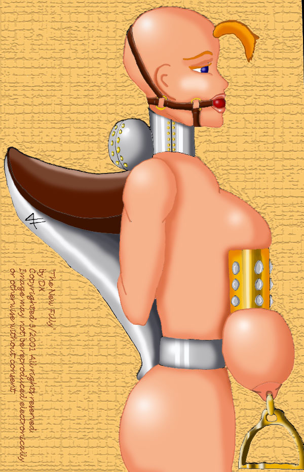 Her reins were removed and replaced with her ball gag. Wildfire was always gagged except for eating and sweet kisses from her mistress. Then her corset, that tight, wind-stealing corset was removed, and replaced with a steel belt that constricted her waist even more. Wildfire cringed from the sparks of the welding gun as it was permanently sealed up.