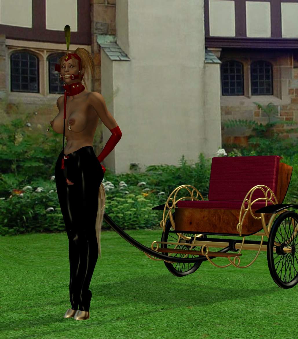 Of course, when the Comte announced that she was available to all for ponyrides the rest of the day, Robert was the first one to get in the carriage and drive her around. He was truly ruthless with his ex-lover, giving her generous doses of the buggywhip while he rode her up and down the hills. He chose a fast paced trot, her nipple bells, her panting and her hooves creating a wonderful symphony. She was truly a gorgeous vision to behold.