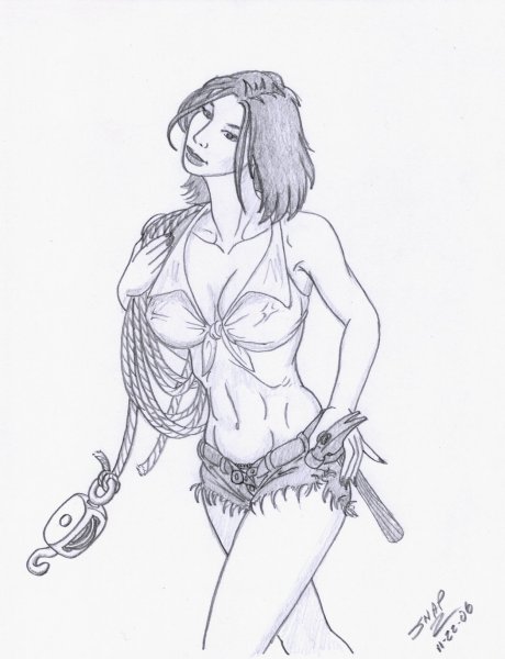 Sitting on the cot, she glanced over at the box, and realized she’d forgotten an important detail. A large black permanent magic marker and a pencil were poking up through her clothing in the bottom of the box. Leaning over from her position on the cot, her breasts swinging below her body, she plucked them from the box. Laying on her left side, she began to carefully trace a design on her right hip with the pencil.