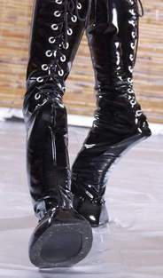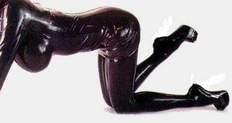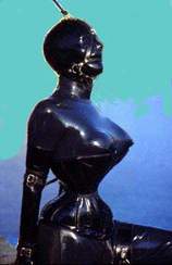 Suddenly everything around Jessica became very dark, there was an intensive smell of rubber and she realized that someone had put a latex eye mask over her face. In horror, she became aware that Renate's rubber-gloved hands were slowly removing her trousers, pullover, panties and bra. A wide, cool leather strap was fastened tightly round her neck, and her waist was enclosed in a very tight bodice-belt; she heard the click of snap links and as if that wasn't enough already she felt the lady present take hold of her right leg, remove her shoe, and press her foot into a tube similar to a boot, tie it tightly and then proceed to do the same with her left leg. It had undoubtedly been a mistake to change from her new riding boots to a pair of comfortable moccasin-style shoes before embarking on the tour through the complex, she realized, somewhat belated. These "special boots" would otherwise not have been quite so easy to apply!