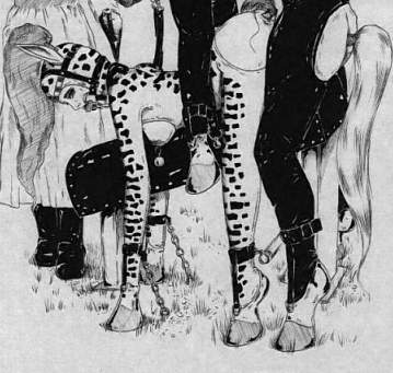 On the one hand, she was forced to stay standing in this thoroughly provocative position, unable to sit down, and on the other hand, the rope which passed through her crotch rubbed constantly at her clitoris, causing one exciting quiver after another to surge over her. Her breath came in rapid gasps as a result, sounding remarkably like the panting of a real horse, an effect which could only be possible as a result of some sort of valve built into the horse's head and the air channels leading to the nostrils. To her surprise, she realized that her treatment so far had not really been unpleasant! Memories of games she had played with a former lover came flooding back...